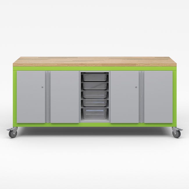 - Organized Storage: One 5-bin storage module and two double storage modules with locking doors offer ample storage space.