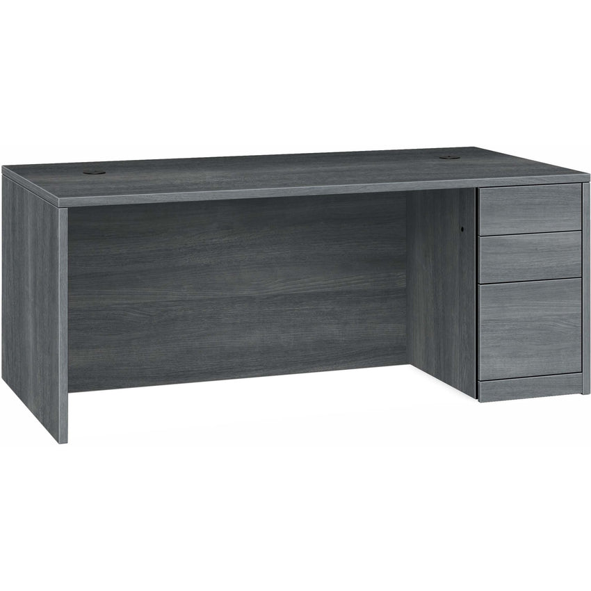 Enhance your office with this right-pedestal desk designed for strength, style, and everyday performance. Crafted from durable, high-performance materials, it features a solid inner-frame construction and a thermal-fused laminate surface that resists scratches, stains, and spills for long-lasting beauty. The Sterling Ash finish and clean, flat edges give it a refined and modern appearance suitable for any professional environment. The desk includes a right-side pedestal with two box drawers for office supplies and one spacious file drawer for document organization. Each drawer features five-sided construction and full-extension, ball-bearing suspension for smooth and reliable operation. Integrated hangrails accommodate letter- and legal-size files, offering flexible storage options. Two 3" grommets ensure efficient cable management, keeping your workspace tidy and organized. A full modesty panel enhances privacy, and a core-removable lock provides secure storage and easy rekeying when needed.