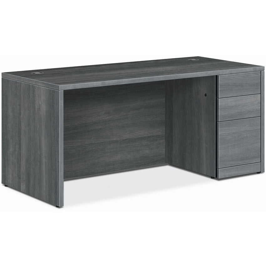 This right-pedestal desk offers a balance of style, strength, and practicality, ideal for modern office settings. Built with a sturdy inner-frame design and finished in elegant Sterling Ash, it provides a professional and contemporary look that complements any workspace. The high-performance laminate surface resists scratches, stains, and spills, maintaining its refined appearance through years of heavy use. Featuring a full modesty panel and smooth, flat edges, it delivers a clean, executive aesthetic. The right pedestal includes two box drawers for organizing supplies and one file drawer for storing documents. Each drawer features five-sided construction for durability and alignment and operates smoothly on full-extension, ball-bearing slides. Integrated hangrails allow letter and legal-size filing, while dual 3" grommets offer easy cable management. The interchangeable, core-removable lock ensures secure storage and convenient rekeying when needed.