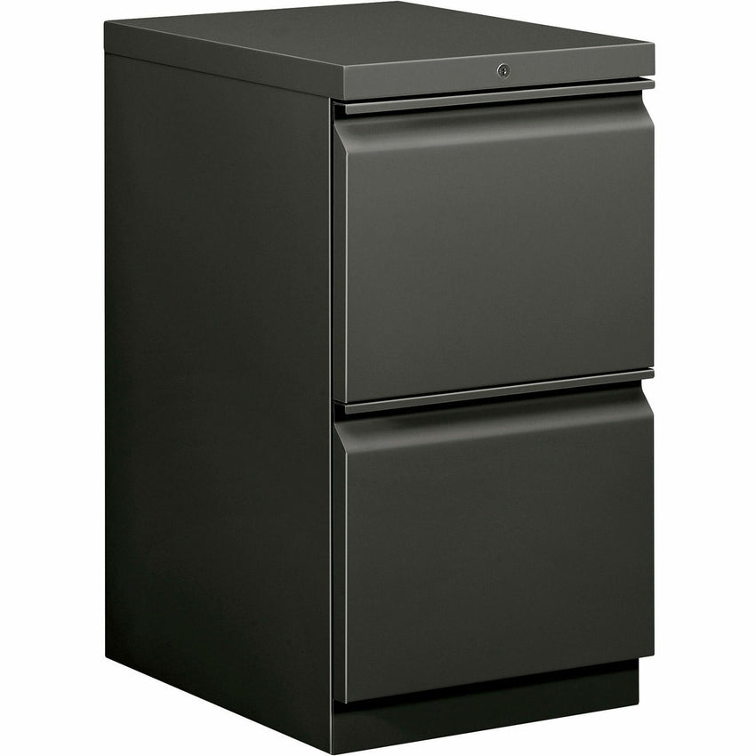 This mobile pedestal delivers dependable filing support in compact spaces while offering easy mobility and secure storage for your daily work essentials. Designed to fit under standard worksurfaces, it features two high-sided file drawers that support front-to-back letter-size hanging file organization. The durable ball-bearing suspension provides smooth drawer operation with 90% extension for better reach and access. A built-in counterweight helps prevent tipping when drawers are open, promoting safer everyday use. This pedestal includes a core-removable locking system for enhanced security, plus fixed front casters and swivel rear casters to easily move and position where needed. With a sleek black finish and performance that meets rigorous industry standards, this pedestal is an efficient and reliable choice for modern workstation storage.