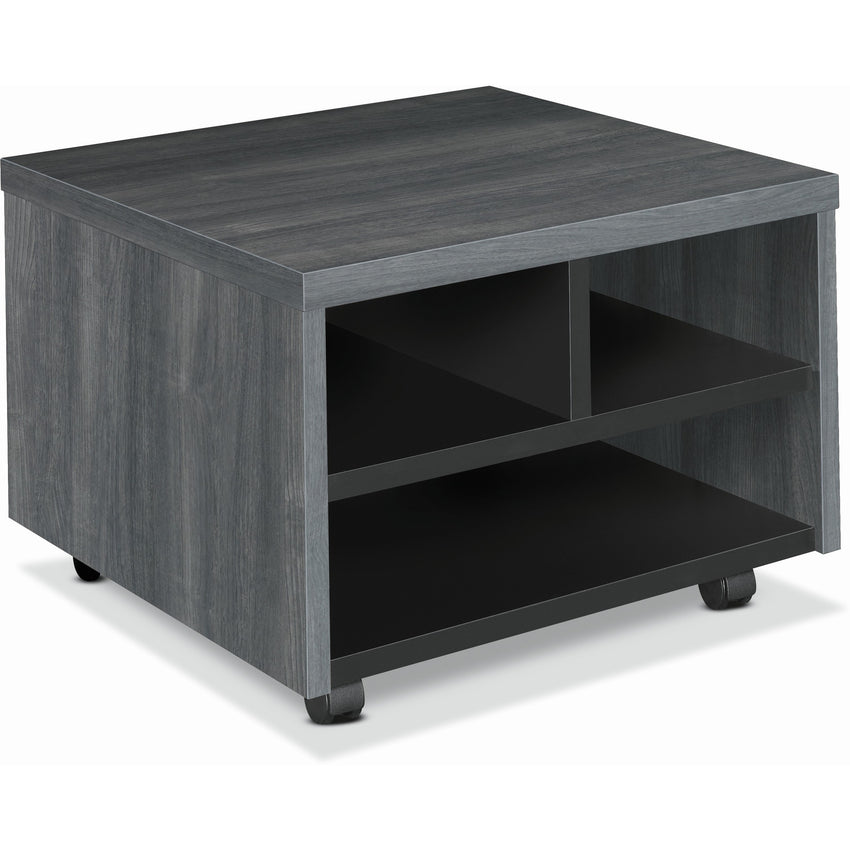 This versatile mobile printer cart offers both functionality and durability, making it a perfect companion for modern office setups. Designed to fit seamlessly under desks, returns, or credenzas, it provides easy access to your printer and office supplies while maintaining a clean, organized workspace. The Sterling Ash finish adds a professional touch and resists scratches, stains, and spills, ensuring long-lasting beauty. Built with a solid 1-1/8" thick top and end panels, along with a sturdy 3/4" back enclosure and shelves, this cart delivers exceptional stability. Its durable inner-frame construction and metal-to-metal fastening system provide reliable strength for frequent movement. Three open compartments offer ample storage for paper, toner, and accessories. Heavy-duty casters glide smoothly across both hard floors and carpet, allowing effortless repositioning anywhere in the office.