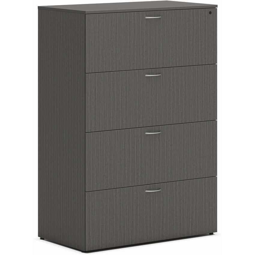 HON Mod HLPLLF3620L4 Lateral File delivers expansive storage in a space-efficient, workstation-ready design. With four drawers, this 36"W lateral file provides plenty of room for letter- or legal-size files while conserving valuable floor space. Each drawer includes hangrails for flexible filing and arranges folders side-to-side to reduce aisle clearance when open. Steel ball-bearing suspensions ensure drawers open fully with smooth, quiet precision, while leveling glides keep the cabinet steady even on uneven flooring.