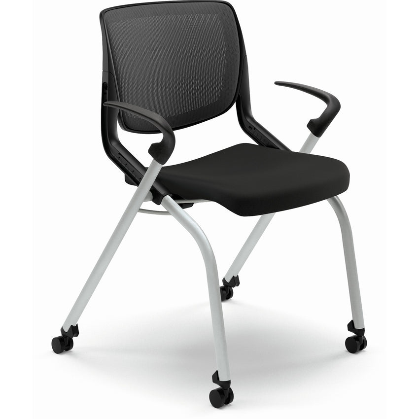 This versatile chair combines ergonomic comfort with flexible storage, making it ideal for dynamic work and learning environments. Its flex-back design and upholstered fabric seat contour to the body, reducing pressure points during extended use. A flip-up seat enables efficient nesting, and chairs stack up to four high to maximize floor space. Fixed arms provide consistent support, while dual-wheeled casters allow smooth mobility for easy repositioning. Constructed with a reinforced resin frame, this chair is durable and supports up to 300 lb. The sleek black upholstery paired with a platinum metallic frame offers a modern, professional appearance, making it suitable for classrooms, meeting areas, training rooms, or collaborative workspaces. This chair balances comfort, adaptability, and long-lasting performance in a stylish design.