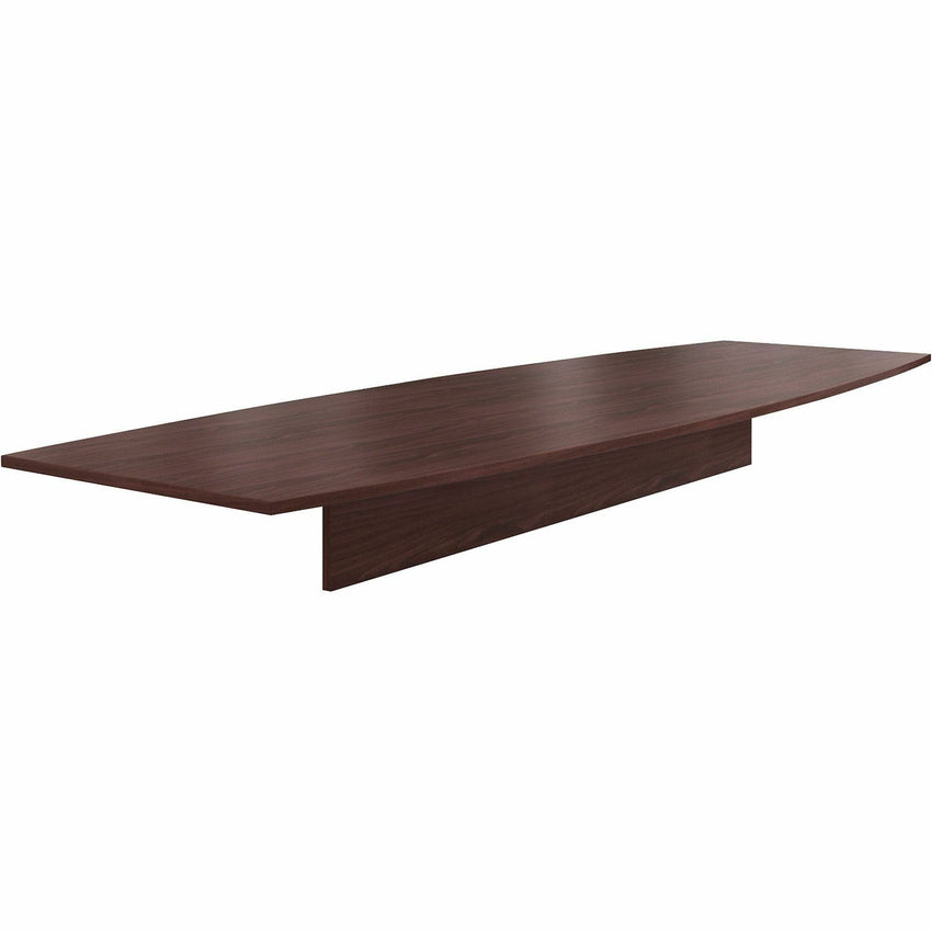 Elegant 12-Foot Conference Tabletop - Create a polished and collaborative meeting environment with this refined 12-foot boat-shaped tabletop. Designed for versatility, its modular structure allows effortless expansion to accommodate growing teams or larger spaces. Crafted from high-density particleboard, it provides a sturdy, warp-resistant foundation ideal for frequent use. The thermal-fused mahogany laminate finish delivers a timeless look while resisting scratches, stains, and spills for lasting durability. A flat edge design offers a clean, professional aesthetic suitable for executive offices and boardrooms. The underside alignment guide ensures easy and accurate base placement, while the slab base design (sold separately) offers generous legroom for comfortable seating. Perfect for high-performance meeting spaces that blend style with function.