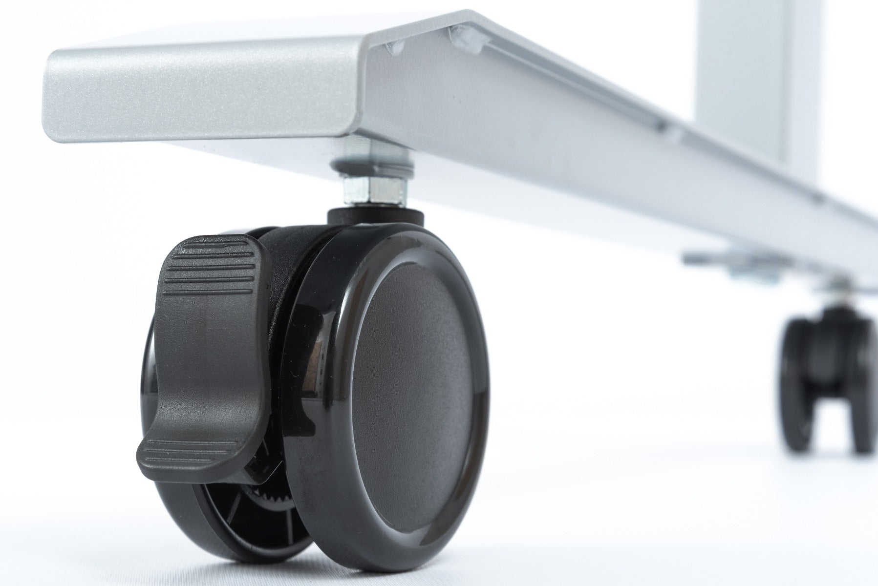 The generous 59î x 29.5î work surface easily fits triple monitors plus a full-sized keyboard and mouse while the height adjustment range accommodates taller and shorter users. Each desk includes a choice of leveling glides as well as 3î casters, two with locking brakes, allowing for easy maneuverability to suit ever-changing workspace needs.