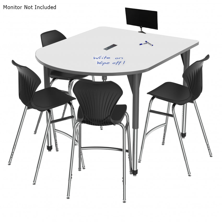 The Marco Premier Series Multimedia Standing Table, model 43-2260-DAP, comes with White Dry Erase High-Pressure Laminate (HPL) top with an integrated Power Module. It is perfect for modern collaborative spaces. This 48" x 60" table offers a dual-purpose surface, serving both as a work area and a dry-erase board for notes and presentations. Its adjustable height from 32" to 42" allows for flexible use, catering to both seated and standing positions. Designed to comfortably seat up to four people, includes a power module with 3 AC outlets and 2 USB ports, offering convenient power access for all your devices. The module comes with a 10-foot power cord and overload protection with a reset switch for safety and reliability.