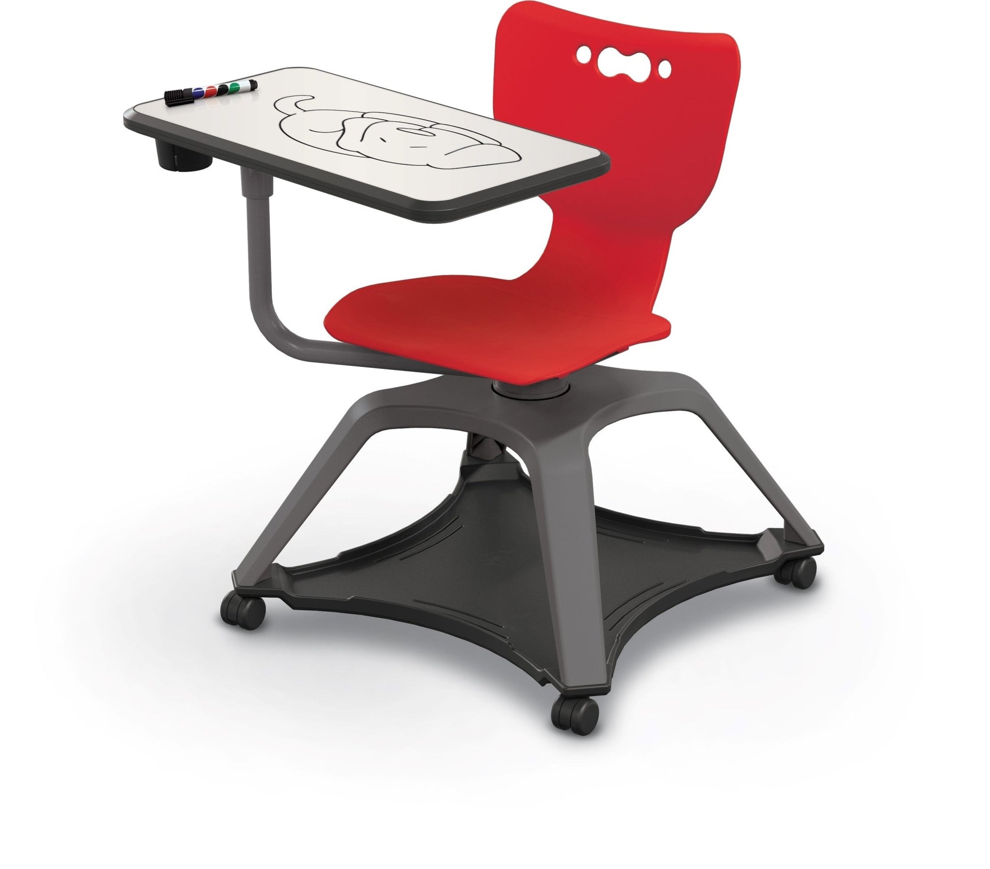 Available with a tablet that works for right- or left-handed users and a shell with 360º rotation, the Enroll Chair makes collaborative room configuration a breeze. Wide tablet for students’ comfort provides ample room for a tablet or other mobile device along with a notepad. Tablet available with a porcelain steel whiteboard top, to provide space for doodling, jotting down notes and ideas, and brainstorming. Porcelain reduces ambient reflection and glare over standard whiteboard, providing a more comfortable to use writing surface. Porcelain also has superior erasability, accepts magnets, and comes with a lifetime guarantee. Flexible and ergonomically shaped seat with lumbar support for easy position changes, eliminating stagnant environments. Smooth reinforced back allows for flex action without sharp ridges.
