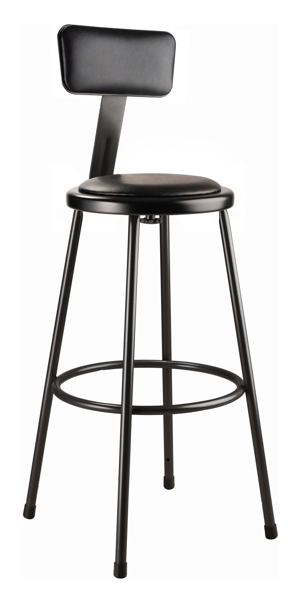 The fortified construction and soft comfort of the 6400 Series heavy-duty padded stools with backrests are ideal for hands-on educational settings like art rooms, science labs, home economics or shop classrooms. This reliable stool features a sturdy frame of 18-gauge steel tubing securely welded to a 14 inch diameter seat pan. Riveted through the steel pan are . 5 inch -thick gray vinyl cushioning that will provide years of dependable use. Footrest ring is securely bonded to each leg with four spotwell contact points. The padded adjustable backrests can be moved two inches up/down and forward/back.