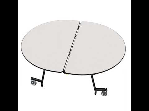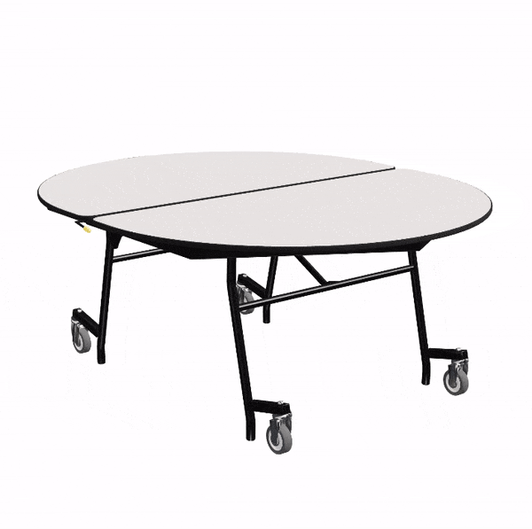Mobile Shape Units from National Public Seating are the perfect solution for those who prefer to use separate chairs in their venue. Built on a solid 14-gauge steel frame with tamper-free hardware, tabletops are protected with a high pressure laminate top and a phenolic backer sheet making them power washable. Our caster lift-off safety feature prevents the table from moving while open. Storage latch release handles are easily accessible from both sides of the table without having to reach in. The storage latch automatically locks when folded for safety. Tables operate smoothly and safely thanks to the NPS EasyLift torsion bar system. The self-leveling automatic down lock engages at a partially opened position for safe, easy cleaning and again at the fully opened position. Available in a variety of shapes, wood cores, color finishes, edge protections and frames.