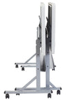 Very easy. The table rolls smoothly on its four casters and nests tightly with others when the top is flipped, allowing for compact storage.