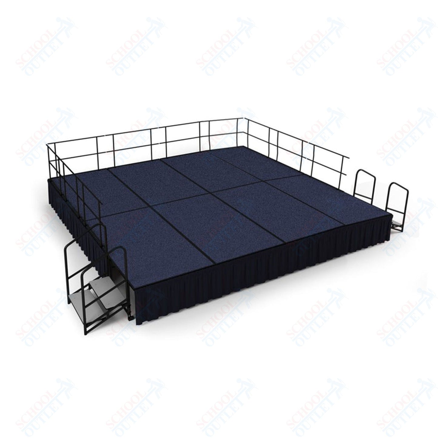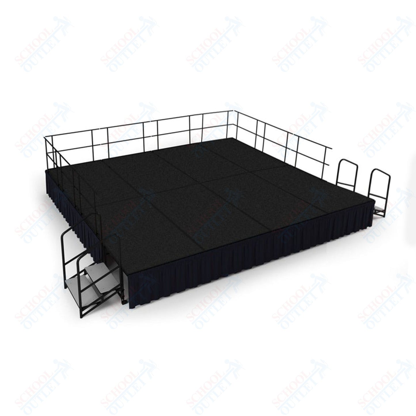 The NPS Portable Stage Group is the reliable and affordable choice for your school performances and assemblies. Users are supported by a heavy-duty, 16-gauge steel, black powder-coated frame. The premium 3/4 inch thick plywood deck is durable and features a firmly-affixed carpeted or hardboard surface. Legs are constructed with 14-gauge steel tubing and feature simple and safe spring-loaded locking mechanisms allowing for quick set-up assembly and folds up easily for manageable portable storage. The stage offers a secure weight capacity of over 200 lbs. per square foot. High-impact plastic glides will ensure floors are protected from damage. Firmly welded ganging devices let users combine equal-height stages to create a large single stage platform or assemble different sizes to create choral or band riser configurations. This set includes two stage steps, 14-gauge guardrails for extra safety, and skirting for an elegant look.