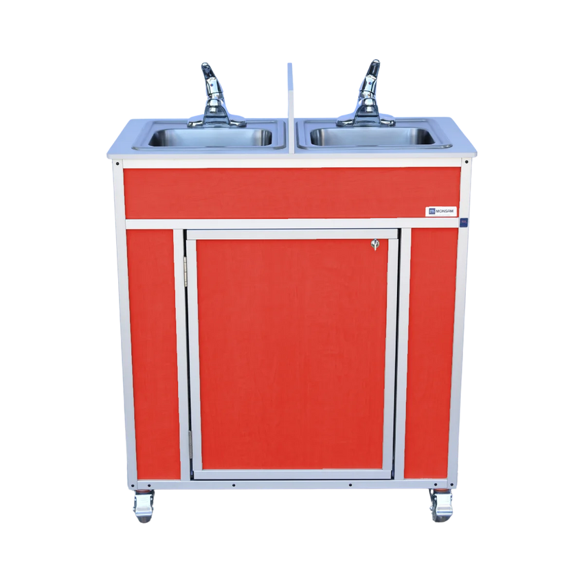 NSF Certified Double Compartment Sink : NS-009D When you have a need for running water where conventional plumbing is not available, our NSF Certified Double Compartment 009D model is an ideal investment. It is space-saving, yet features two large sinks that allow for ample elbow room. This NSF dual basin sink comes with plenty of space for towels and dual fresh/waste water tanks, making it truly self-contained. Lightweight and easy to move, it comes on durable swivel casters that lock as needed. This makes it a perfect choice for both indoor and outdoor events. Available Upgrade in Stainless Steel Finish Soap Dispenser and Towel Bar available as accessories See Recommended Accessories tab for more options