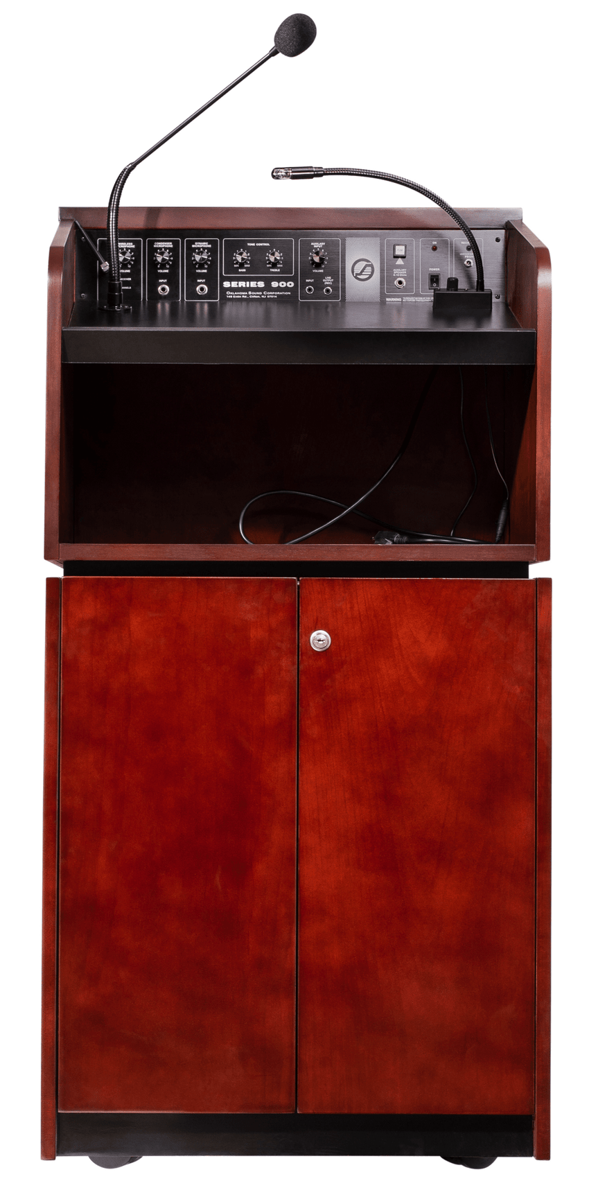 The Model #950/901 Combo is a gorgeous tabletop lectern with floor lectern base. It features cabinetry of a rich wood mahogany-on-walnut veneer over a solid plywood core and includes a built-in 75-watt amp ideal for large venues up to around 75,000 square feet. Four 4 speakers with radius-style grilles are mounted directly into the unit's curved corners. Multimedia capabilities include simultaneous usage with two microphones and one wireless. This sound lectern comes complete with a 24” built-in gooseneck microphone and a tie-clip/lapel mic with 10' cable. It operates either by AC plug or with optional battery model PS12-V and features input jacks for CD players, extension speakers, recording outputs and playing MP3s. Four feet tall, this unit also includes three sizeable storage spaces two with a five-level adjustable shelf behind two locking doors with fingertip indents for easy opening. An adjustable halogen reading lamp is also included to illuminate the ample 22” x 14” reading surface, large enough for 3-ring binder. A surface-mounted digital timepiece has also been added for monitoring speech duration. Ships fully assembled.