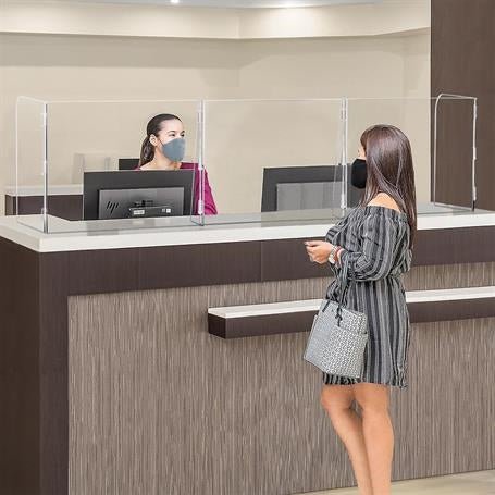 94 1/2" 3 panel 1/4" acrylic counter partition safety barrier with no pass through opening. Designed for a 8 foot counter top. Features interlocking middle supports and side supports. Anti-skid rubber components included. Easy slide-in assembly construction. Ships flat. Includes three 31 1/2"x 23 1/2" panels. Blank. Add optional Digi-Color imprint. Can be customized to size, shape, and options specifications. Minor assembly required. Installation not included. Non-returnable. Made in the USA.