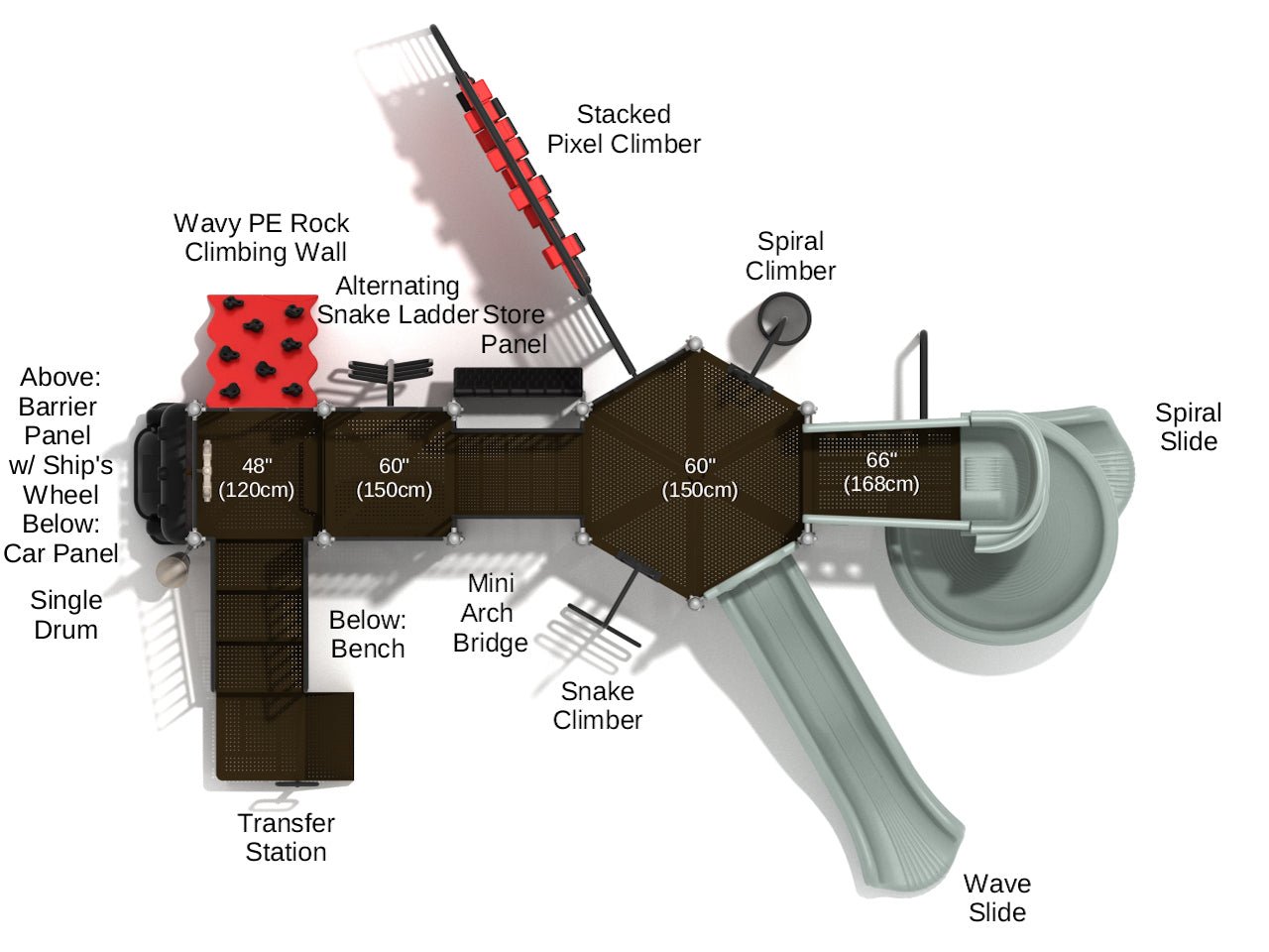 Rising tall above the playground, the Bold Pixel Climber instantly captures every child’s attention. This dynamic structure features a series of colorful 3D blocks and cut-out spaces, offering a fun and challenging alternative to traditional climbing walls. Younger climbers can tackle the Wavy Rock Wall for a gentler ascent, while more daring kids can choose the Snaking Rope Ladder or Serpentine Climber for an exciting climb to the upper deck. At the top, children can enjoy the adventurous Spiral Slide or the smoother Wave Slide for their descent.