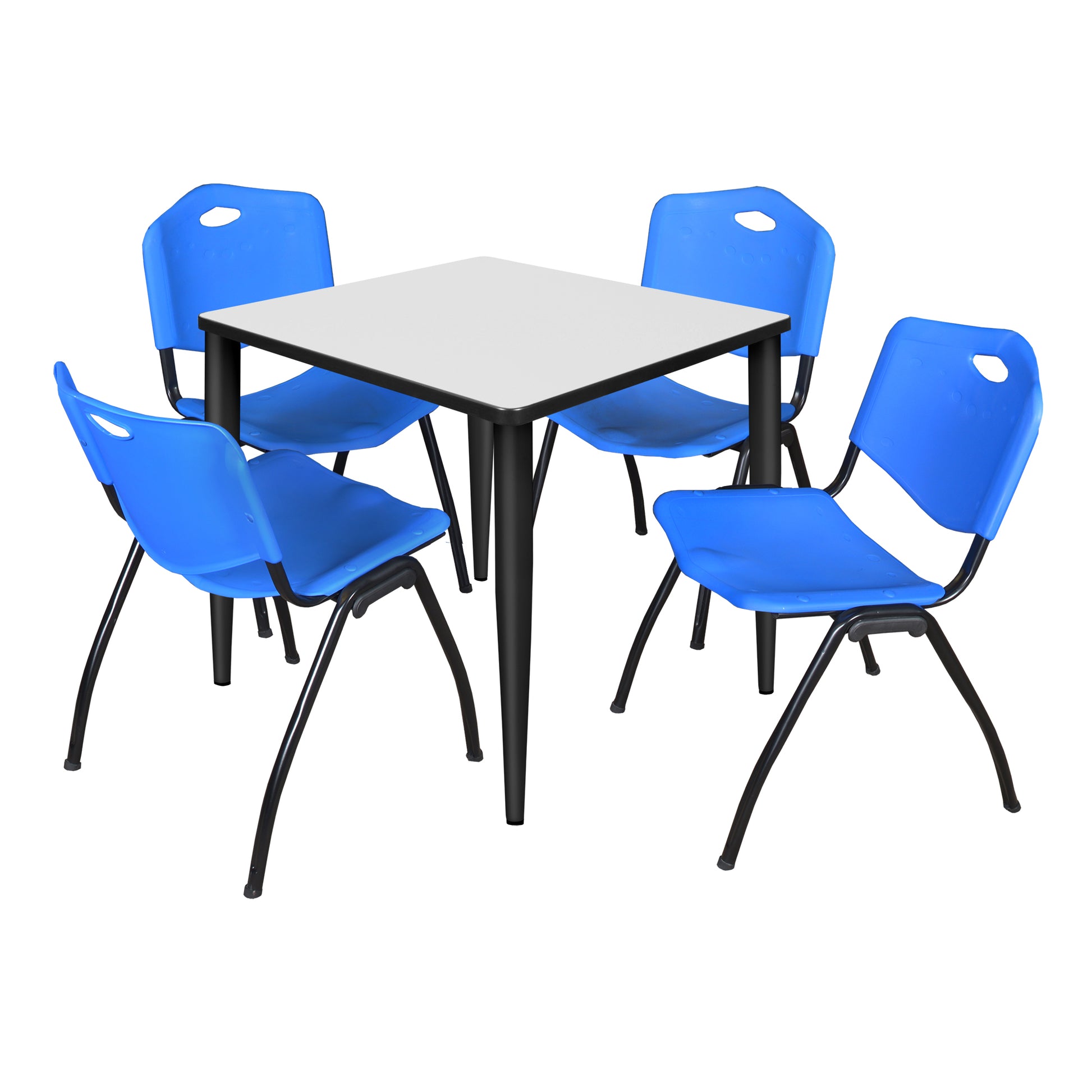- Versatile table and chair set includes one 30-inch square table with modern black tapered legs and 4 Blue "M" Stack Chairs