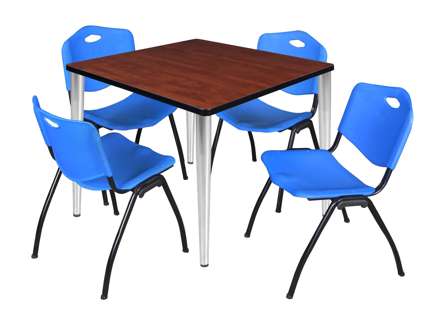 - Versatile table and chair set includes one 36-inch square table with modern black tapered legs and 4 Blue "M" Stack Chairs