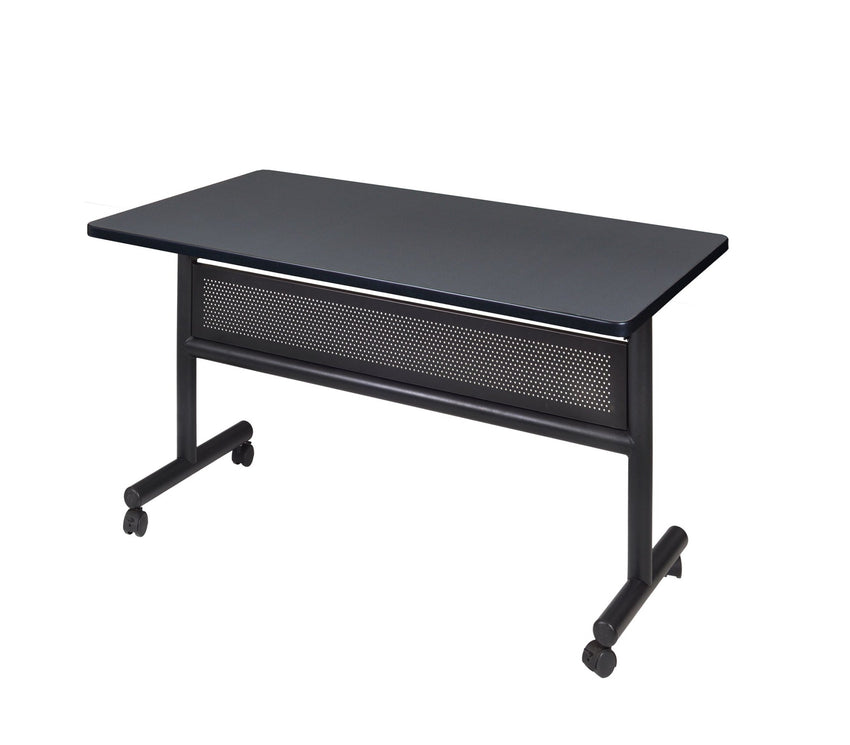 Set up a meeting room in a flash with Kobe Flip Top Tables. Unlock the quick-release lever and flip down the entire tabletop to nest together when not in use. Perfect for rooms with variable class size, the Flip Top tables save set up time and storage space. This 48-inch long table is constructed of a thermal fused melamine laminate tabletop that is 1-inch thick and finished with a black T-Mold edge band. The tabletop is double-sided and finished on the other side. Simply pick the side you like and install the base on the other. Self tapping wood screws and a placement template are included. Laminates are scratch, stain and scald resistant and wipe clean easily. Rounded corners make the table safer for everyone. The base is constructed of black tubular steel. Locking casters make these tables mobile and are ideal for computer labs, training rooms, classrooms and more. Kobe tables are backed by a 10-Year Limited Manufacturer's Warranty.