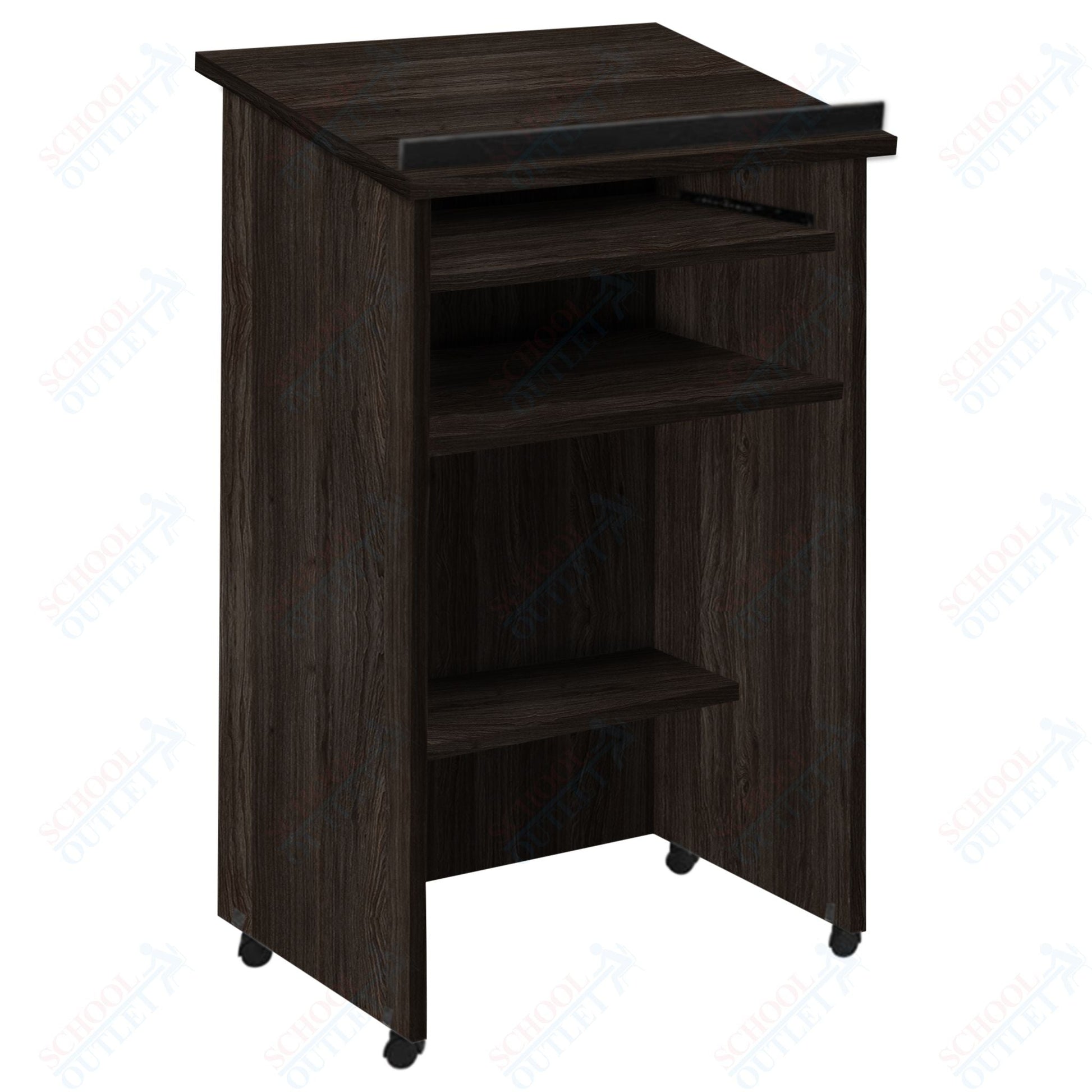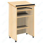 Perfect for presentations, this school podium with wheels has several features that set it apart from other lecterns and podiums. The sloped top keeps papers and items at the right angle for reading, and the retaining edge keeps papers from sliding off. A pullout keyboard tray and a sturdy shelf make this podium versatile. Other features include specially designed casters that can easily roll over uneven floors and thresholds, making it easy to go from one area to the next.