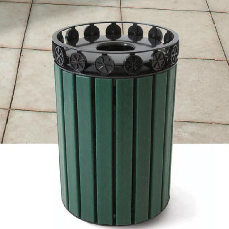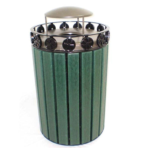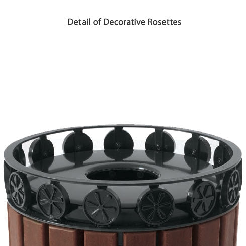 The Charleston Trash Receptacle is made of recycled 2" x 4" boards with powder-coated ornamental rosettes around the top of the receptacle. There is a lid and a liner included. Portable or wall-mounted options are available.
